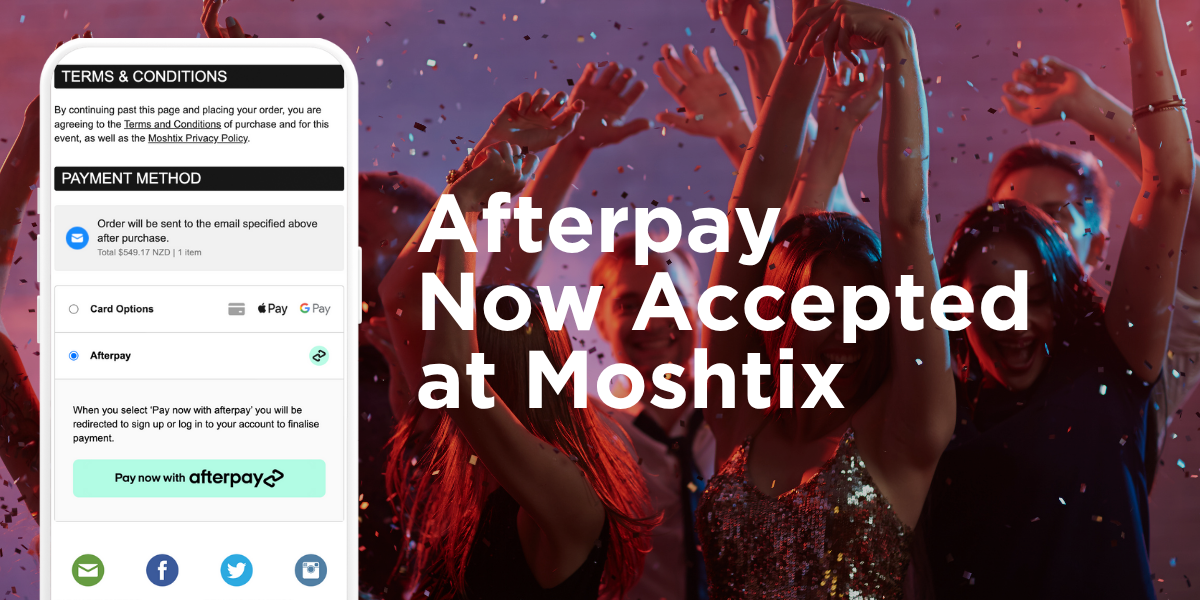 We’re always looking for ways to make live easy—for both fans and event organisers. That’s why we’re excited to share that Afterpay is now available as a payment option on Moshtix!*