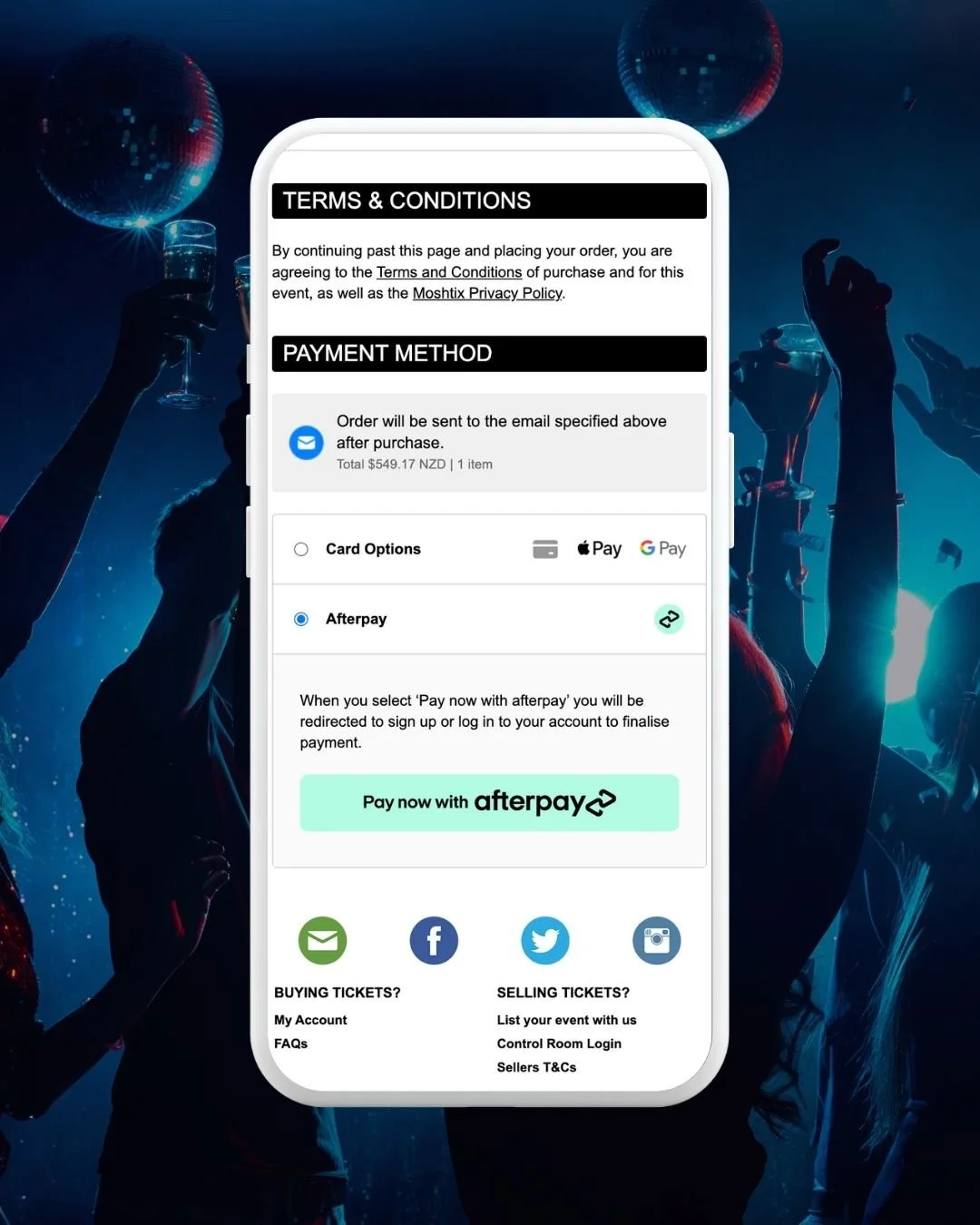 It’s simple: Afterpay now appears as a payment option during checkout. Fans who choose it will be able to split their total into four equal payments over six weeks. There's no changes to your payout process – Afterpay will be treated like other BNPL and digital wallet payment methods processed to Moshtix’s merchant account.